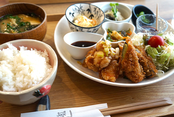 NEWS 香川県産の食材にこだわったカフェ食堂 香川県丸亀市にある寅食堂です。当店では実家に帰ってきたような落ち着く空間で香川県産の食材をふんだんに使ったランチをお楽しみいただけます。 RECOMMEND ~当店のおススメ~ 当店の週替わりランチは、香川県産の新鮮素材を使ったメインと5種類の小鉢が毎週入れ替わり、寅のモチーフがかわいいオリジナルの器で提供しております。味も見た目も楽しめる、訪れるたび嬉しい、特別なランチタイムをぜひお過ごしください。 TOPICSお知らせ TOPICS一覧へ ■Instagramでも情報発信しています!併せてご覧ください。 公式instagramページお店の写真をリアルタイムで更新中! INFORMATION 店舗情報 住所 〒763-0095 香川県丸亀市 垂水町2084-1TEL:0877-35-9884 (地図を印刷) 営業時間 11:00~14:30 定休日 土・日・祝日 アクセス 電車:JR土讃線善通寺駅より車で約9分、車:高松自動車道善通寺ICより約10分 平均予算 1,400円~2,200円 駐車場 13台 カード クレジットカード利用可能(VISA,MasterCard,JCB,AmericanExpress,Diners,その他) 席数 24席